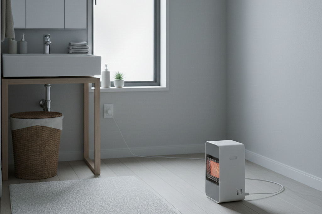 洗面所・脱衣所には、一応、小型ヒーターを置いてみました。